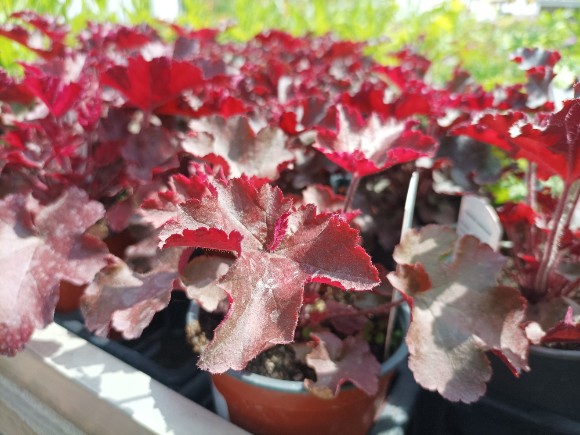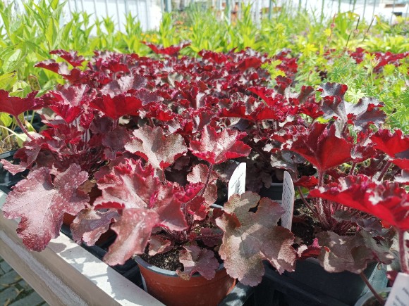 Trvalka okrasná listem, vínová barva listů, nenápadné bílé květy.